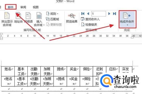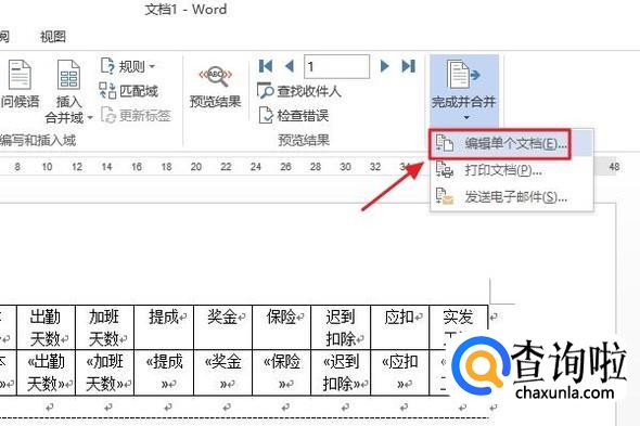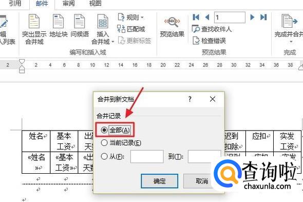最后一步,依次点击“邮件”-“完成并合并”-“编辑单个文档”,在弹出的合并到新文档里,我们点选“全部”,最后点击确定,工资条就制作完成了,效果如图所示...