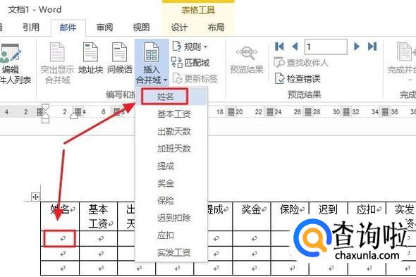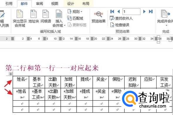 接着我们选择第二行的第一个表格,然后依次点击“邮件”-“插入合并域”-“姓名”,第二行的所有表格里全部将其一一对应起来,最终效果如图二所示;