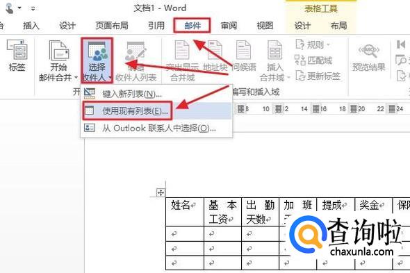 然后依次点击“邮件”-“选择收件人”-“使用现有表格”,然后将之前Excel表格里面的基础数据导入进来,如图所示...