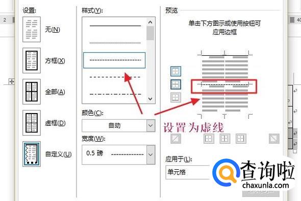 为了便于以后打印出来裁剪,我们可以将最后两行之间用虚线隔开,首先选中这两行,然后点击鼠标右键“表格属性”,然后在表格属性里找到“边框和底纹”,将两行之间设置为虚线,然后其他边框全部去掉即可;