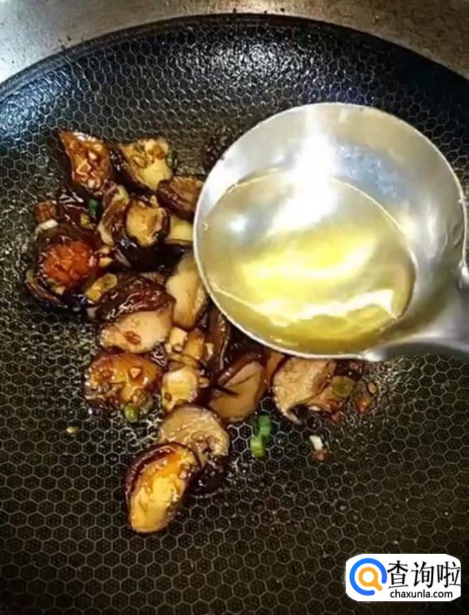 放入适量的海鲜酱油,一勺的蚝油,然后放入香菇,放入一勺水,加入盐,鸡精,适量的老抽上色,最后淋入水淀粉勾芡,翻炒均匀