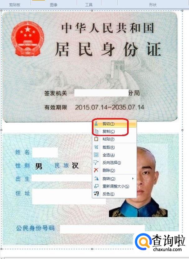 如图所示,先后把两张图片粘贴到画图中,并移动到合适位置,然后用选择工具把两张图片都选中,右键点击“剪切”或者“复制”。