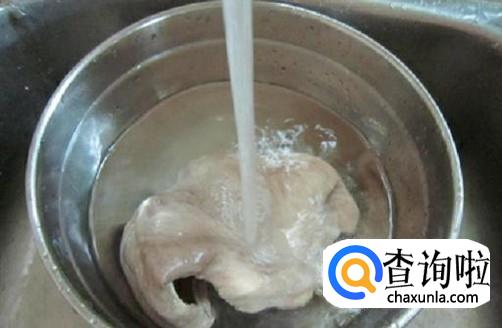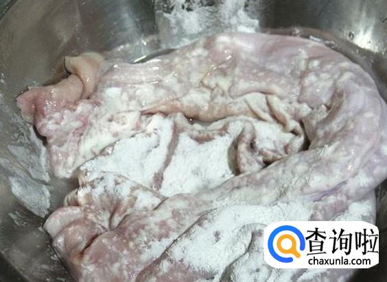 猪肚把里面翻出来,放1抓面粉进去抓7分钟左右,然后用清水清洗几次,再把猪肚反转回来。