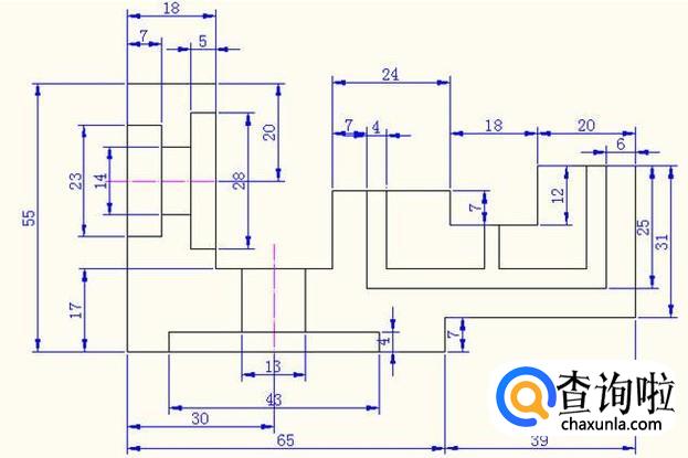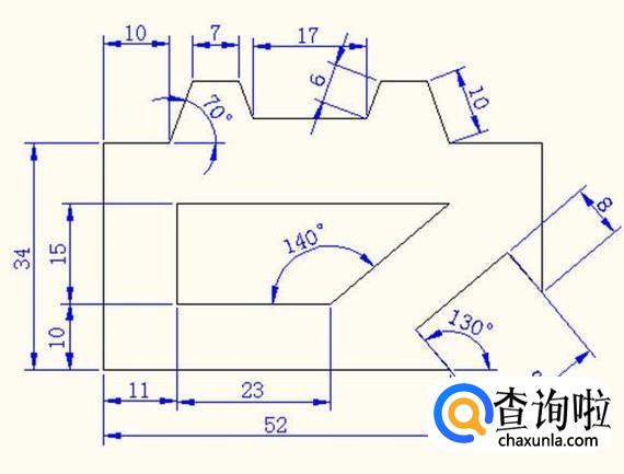 绘图步骤:建立三个图层,分别为绘图、尺寸标注、辅助线图层;绘制辅助线,利用计算的坐标和原图给的相应线段尺寸完成外框;里面的图形可通过计算相对偏移量来进行相应的偏移即可依次完成各线段的画法,修剪多余线段;最后进行尺寸标注。