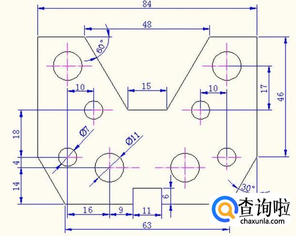 审图:需要三个图层,分别为绘图、尺寸标注、辅助线图层图层;此图为左右对称图形课通过镜像命令画图,先画左半外框和里面的四个圆即可