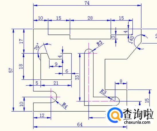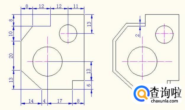 绘图步骤:建立三个图层,分别为绘图、尺寸标注、辅助线图层,由点(14,0)开始依次画出各个外框线段,计算两圆的圆心坐标画圆;把左边的图通过复制再通过偏移相关线条和修剪多余线条完成绘图;最后进行尺寸标注。