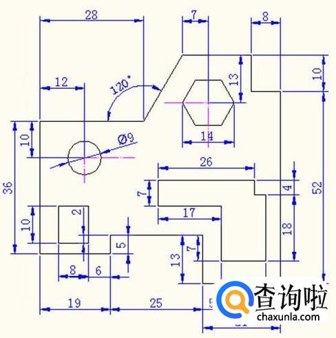 绘图步骤:建立三个图层,分别为绘图、尺寸标注、辅助线图层,使用line的正交模式、极轴追踪模式和相应尺寸完成外框;分别确定圆、正六边形的圆心和中心;确定内矩形框的两点坐标,内多线段框绘图起点坐标(49,-2)完成绘图;最后进行尺寸标注。