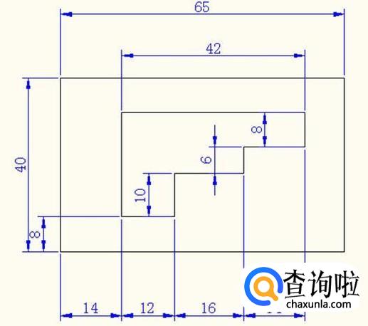 绘图步骤:先建立两个图层分别是绘图、尺寸标注图层;外框从两个方向(上、右)利用正交模式画,内框从点(10,6)开始,利用正交模式和相关线段尺寸画出;最后按照原图进行尺寸标注。
