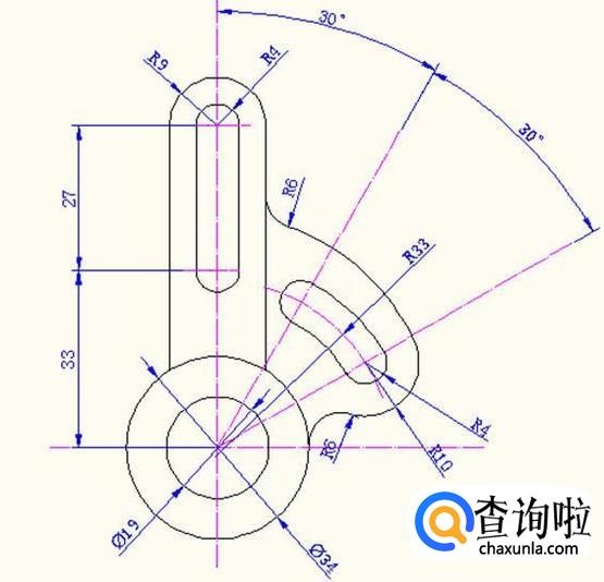 绘图步骤:建立三个图层,分别为绘图、尺寸标注、辅助线图层,通过相应尺寸和旋转角度画出各条辅助线,画左下两同心圆和上部的三个圆利用正交模式和对象捕捉中的切点画出四条竖直直线,修剪多余线段;画出R33的辅助线,定位出各个圆心坐标完成两圆和两段圆弧相切的曲线图形(右里面的图形),修剪多余线段;作R10的圆,再作R6的圆与两圆相切,作一大圆与R10的圆外切,再完成其他圆弧的相切,修剪多余线段;最后进行尺寸标注。