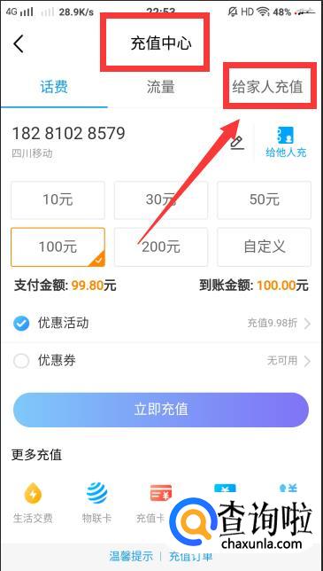 进入【充值中心】页面后,点击右上角的【给家人充值】并进入。