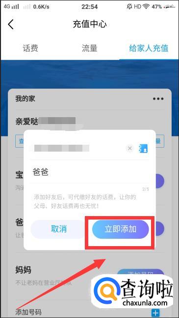 进入后,会跳出一个界面,显示【添加号码】,以添加爸爸的号码为例,进入添加爸爸手机号码的界面,输入号码,点击【立即添加】即可。