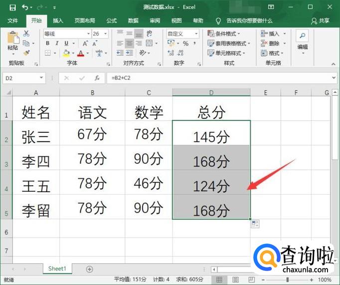 最后,我们在D2单元格输入【=B2+C2】,按下回车即可得到总分数,鼠标下拉填充即可得到剩余单元格数据