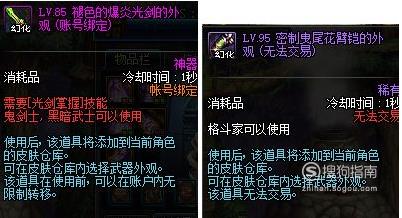使用秘传模具制作出来的为帐号绑定粉色武器幻化,神奇模具则为无法交易紫色武器幻化,并且提示也很明显,必须有光剑掌握才能使用光剑幻化,因此红眼鬼泣阿修罗不能带光剑。