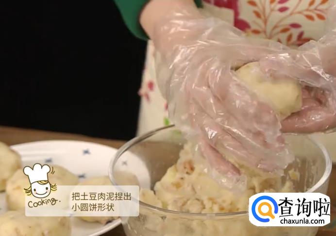 碾压成土豆泥后,加入炒香的猪肉洋葱,混合搅拌。