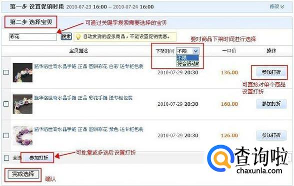 在选择宝贝时,如果“操作”中已经显示为“不参加了”则代表该类宝贝已经设置了打折,此时可点“不参加了”进行取消打折。