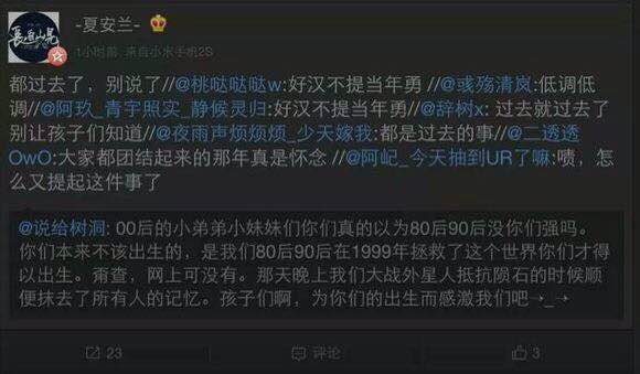 传说1999年,外星人入侵地球,由于战场情况特殊 80前无法进入战场,80后90后作为抵抗外星人的主力,英勇奋战,牺牲了无数少年少女打退了外星人的进攻。但是80后90后也付出了惨重的代价。原来80 90后也和60 70后一样有很多兄弟姐妹,在战争中,几乎都牺牲了,几乎只剩一颗独苗。这段历史太吓人,为了00后健康成长,80 90后再退出战场时集体起誓,封存这段记忆 不得像外界透露1999年大战的任何事情。(酷知网提醒您,纯属娱乐!)
