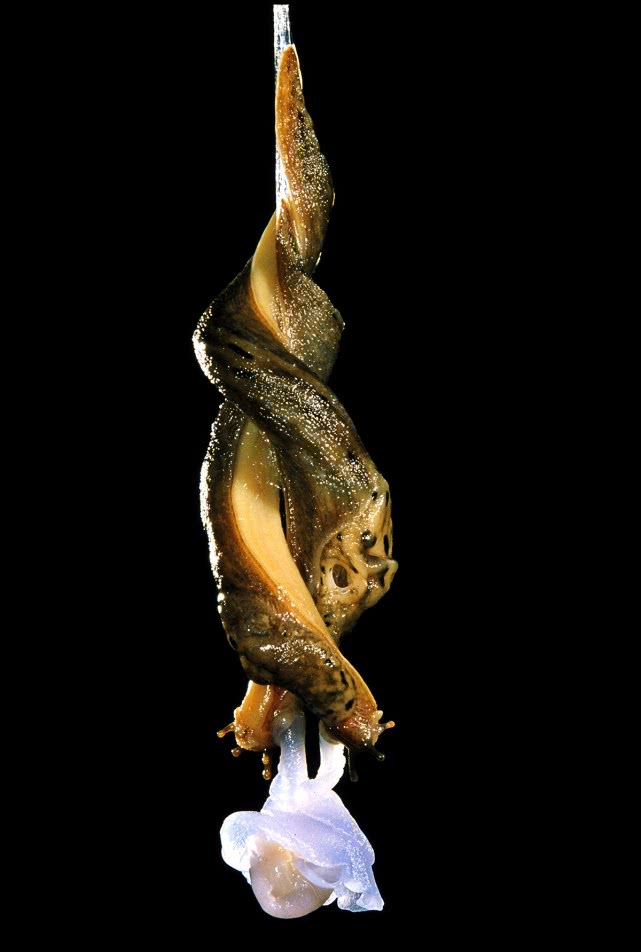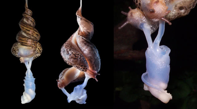 与此同时,它们分泌大量的黏液,以便使自己的脚粘在树干上,整个躯体呈头朝下的倒挂状。接下来,亮“剑”的时刻到了!阴茎在未勃起时就像泄了气的气球,藏在鼻涕虫头部附近的一个洞里。但随着血淋巴(一种相当于软体动物的血的淡蓝色液体)的注入,阴茎会充盈、膨胀、伸长。这对小“恋人”各自的阴茎在渐渐变大的同时,也互相缠绕在一起。