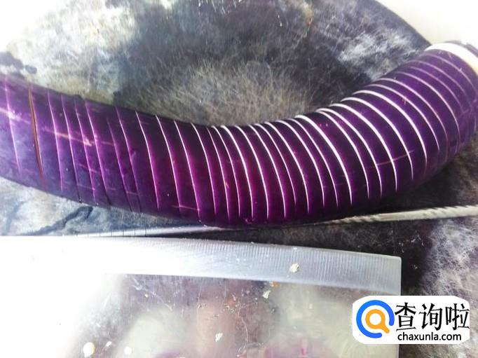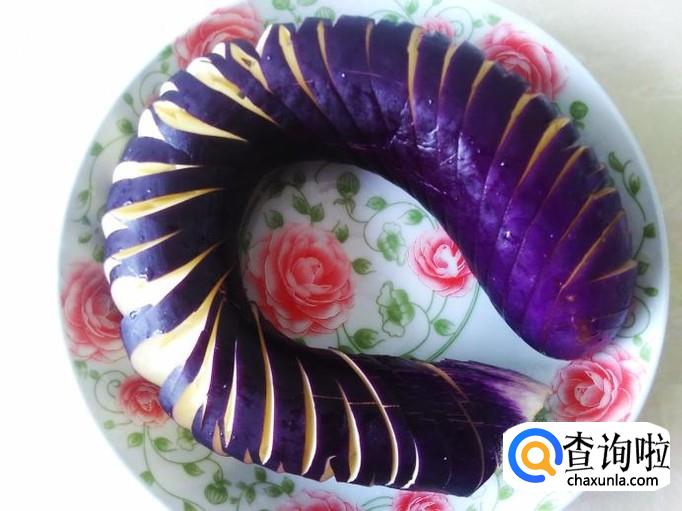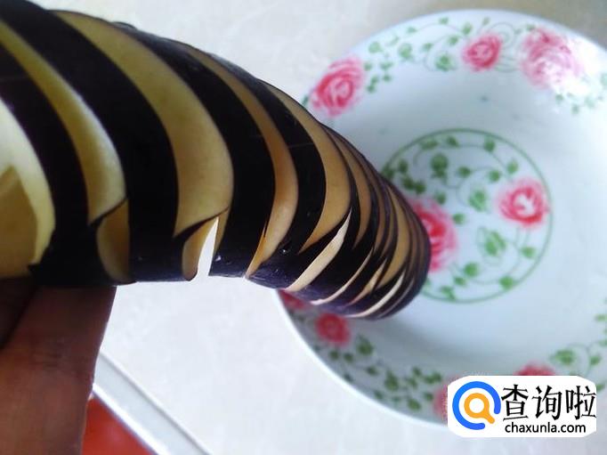 再反过来把另一面侧切连刀,这样就把茄瓜切成旋螺状了。