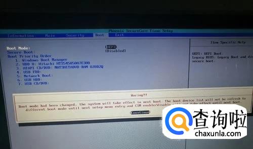 之后又会有很多的选项,我们找到“Legacy BIOS”,按回车键,会有一个警告的提示框弹出来,我们还是按回车。