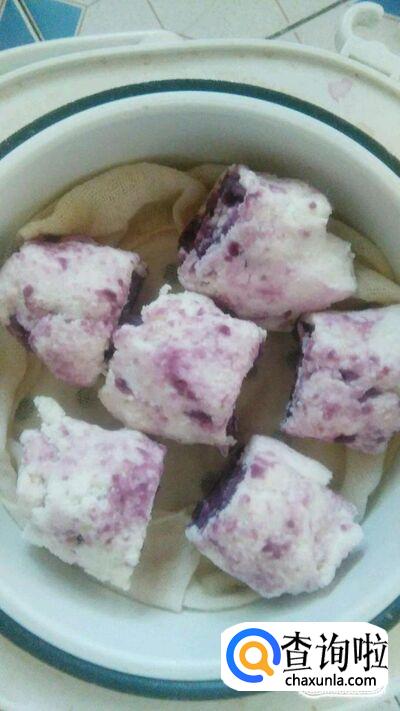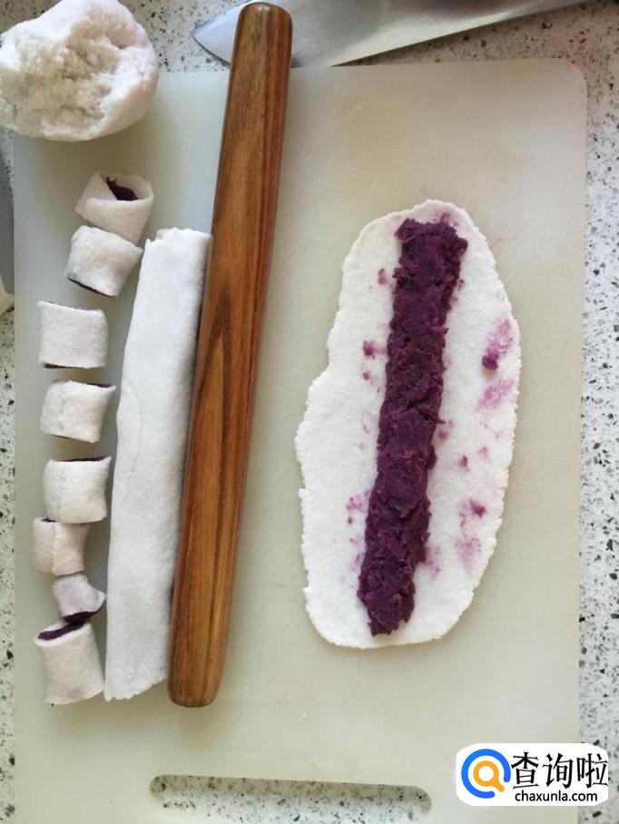 然后把紫薯泥铺在淀粉面团上面,然后卷起来切段,然后放在蒸锅上面蒸十几分钟分钟就可以了。