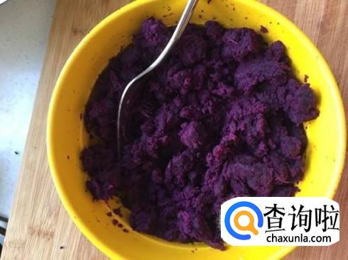 我们先把从超市购买的紫薯洗净,去皮,放入蒸锅上面蒸熟,然后用勺子捣碎,做成紫薯泥。