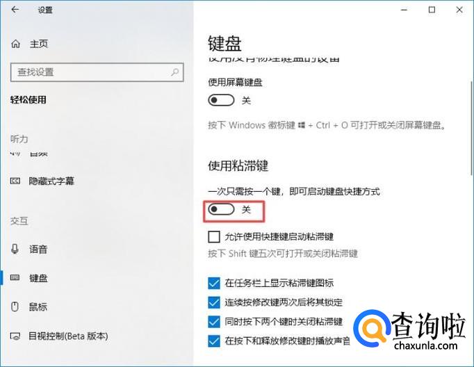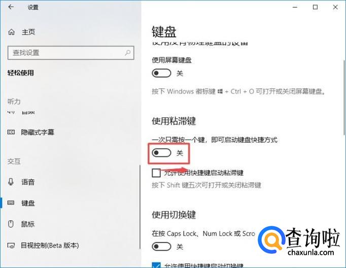 想要关闭粘滞键的话,我们将开关向左滑动,这样我们就关闭粘滞键了。
