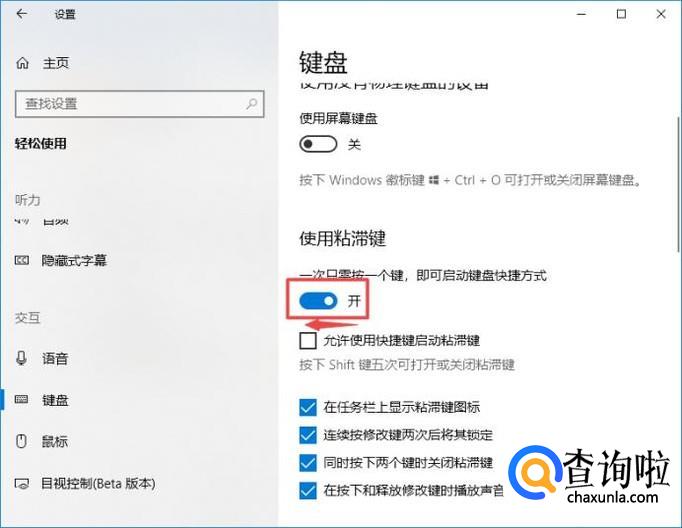 之后我们就可以看到粘滞键的设置了,我们将开关向有滑动,这样我们就开启粘滞键了;