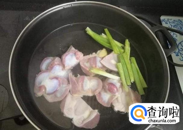 接着我们就可以把腌制好的鸡胗放入冷水锅里面煮,把鸡胗煮熟后我们就可以过凉水备用。