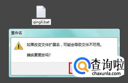 修改后的文件名为“qingli.bat”,提示是否修改扩展名,选择“是”,这种文件不复杂,修改扩展名是可用的;
