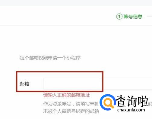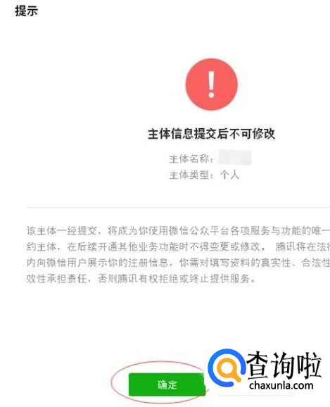 再往一步,看到了一个红色的叹号,提示你的主体信息一旦提交不可更改,你必须认真再检查一次,确定无误后点确定即可。
