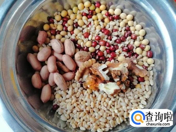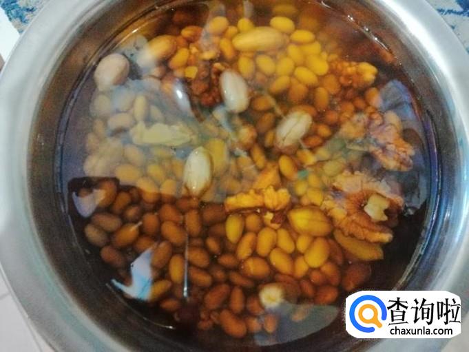 如下图泡好所备的食材,加这些食材营养会更丰富,而且打出的豆浆香味会更浓郁,我这是晚上睡觉前泡的,早晨起床打豆浆就比较方便。