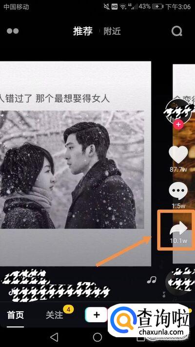 首先打开抖音短视频APP,翻到自己喜欢的视频,然后点击下方的分享,如下图。