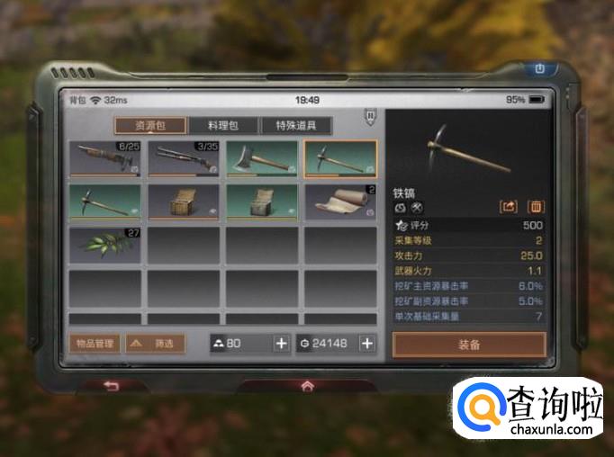 来到秋日森林场景后,接着装备上石镐或者铁镐,徒手是无法采集到铁矿的。