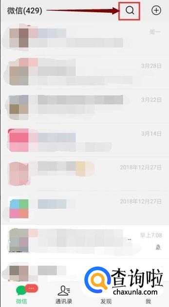 首先,我们在微信首页的右上角找到“搜索”图标,形状类似放大镜,点击它,如图所示。