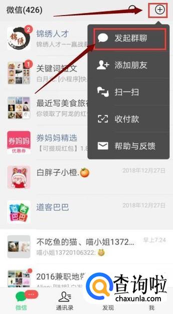 在微信首页点击”+“,然后点击下拉列表中的”发起群聊“,如图所示。