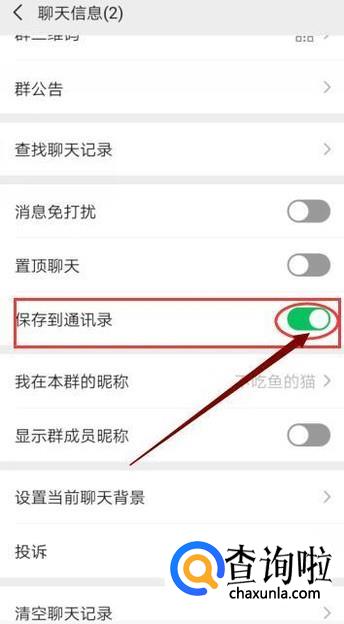 在聊天信息界面将”保存到通讯录“按钮从左边拨动到右边,让它变蓝。