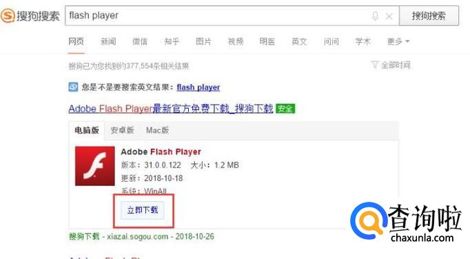 在搜索工具中检索“flash player”,在搜索结果中点击立即下载按钮。注:这里以win系统为例,如果大家用的是其他系统,可以切换到安卓版或Mac版。