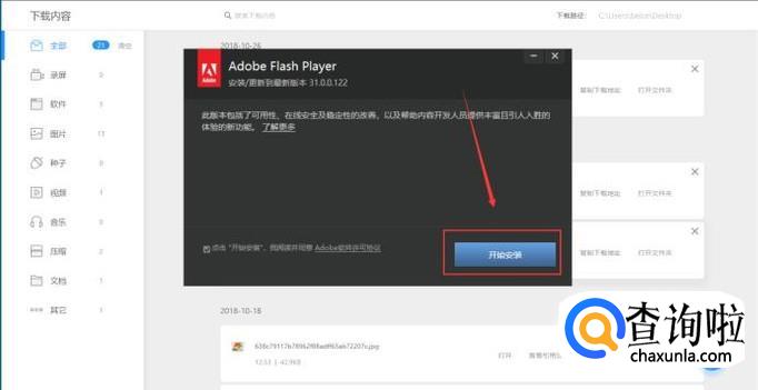 在“Adobe Flash Player”安装窗口,点击“开始安装”。