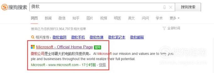 通过检索工具搜索“微软”,选中官方网站进入。