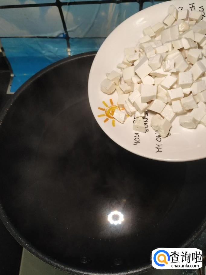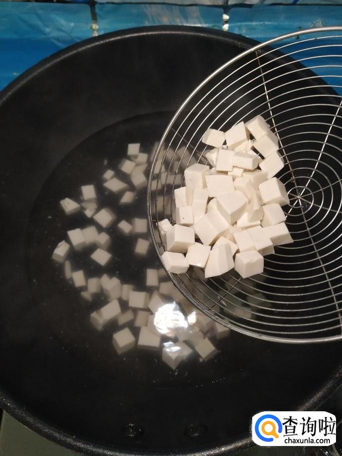 锅中烧开水,水开后将豆腐放入锅中焯水,焯好之后,捞出过凉水,放入盘中,控干水分备用。