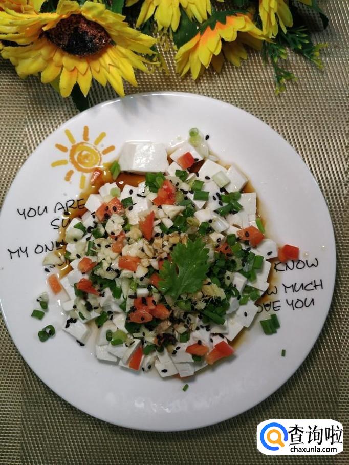 豆腐适量,小葱适量,姜适量,蒜适量,红椒适量,枸杞子适量,黑芝麻适量,香菜适量,盐适量,鸡精适量,生抽适量,香油适量。