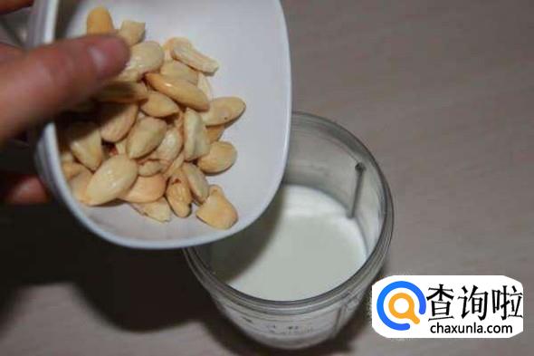 然后把牛奶加入搅拌机,然后把泡好的杏仁倒入,把吉利丁片也放入搅拌机,打开后搅拌5分钟左右