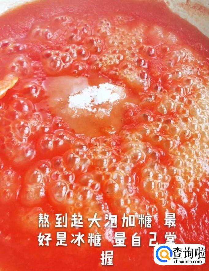接着等到锅中的番茄酱熬到起大泡,加糖继续熬,如下图所示。小贴士:最好选择冰糖会比较好。