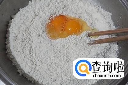在盆中倒入一斤面粉,之后加入两个鸡蛋,少量花生油以及水,然后揉搓成软硬适中的面团,用保鲜膜盖住醒十分钟。