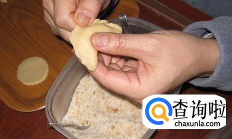 将面团切成薄块,用瓶盖印出一个个小圆片,然后将馅料小心的包裹在里面,使其呈现出月牙状。