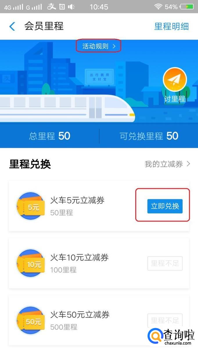 就能看到“会员里程了”,如图所示,根据你目前积攒的总里程,就能兑换火车立减券了。