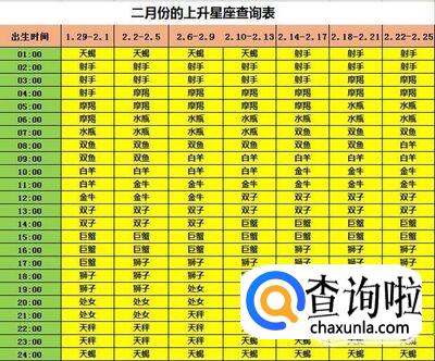 出生日期为二月份(1月29日-2月25日)的上升星座查询表,例如出生日期是2月4日下午4点15分,那么根据下面的表格,红色和绿色部分的表格对应,得出上升星座为上升巨蟹座。