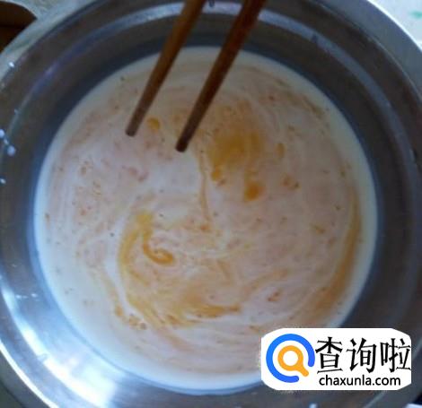 在上述的牛奶中加入80g的淡奶油,可以使蛋挞吃起来更有奶味。注意一定要顺着一个方向搅。