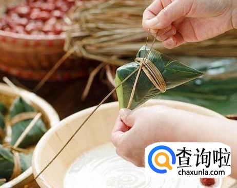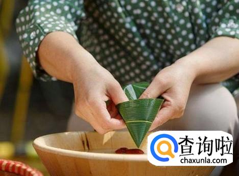 放好米和枣之后,将余下的粽子叶扣在圆锥体的上方,并向下折,包住圆锥体,余下的叶子扭一下,包在粽子侧面,然后用草绳或线绳在粽子上缠绕,再打个结,把粽子捆结实,粽子就包好了。