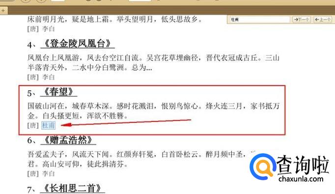 然后就会自动搜索,如图关键词“杜甫”就被搜索出来了,系统自动会选中方便你的查看。